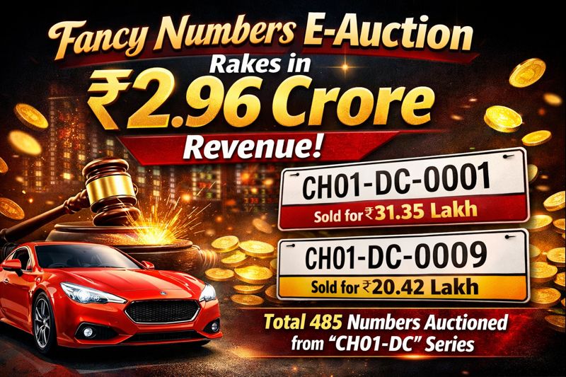 The office of Registering & Licensing Authority, UT., Chandigarh has conducted e-Auction of vehicle registration numbers (fancy & choice) of new series “CH01-DC” from vehicle numbers 0001 to 9999 along with left over fancy/special registration numbers of previous series from 20.12.2025 to 22.12.2025 in which 485 total registration numbers have been auctioned. Resultantly, enormous revenue Rs. 2,96,31,000/- has been fetched.