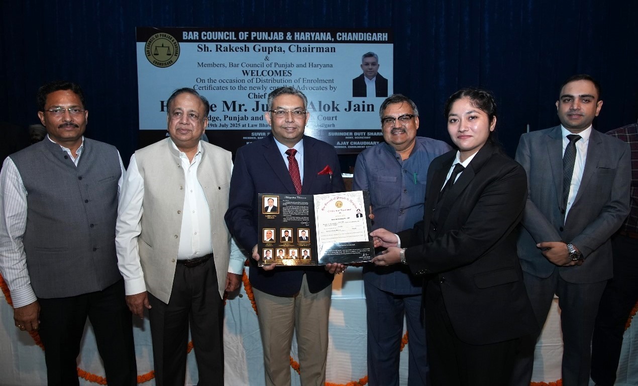 In a significant milestone for the legal fraternity, Hon’ble Mr. Justice Alok Jain, Judge, Punjab and Haryana High Court, graced the convocation ceremony organized by the Bar Council of Punjab and Haryana at Law Bhawan, Chandigarh, as the Chief Guest, where he administered the oath and distributed enrolment certificates to 454 newly enrolled advocates.