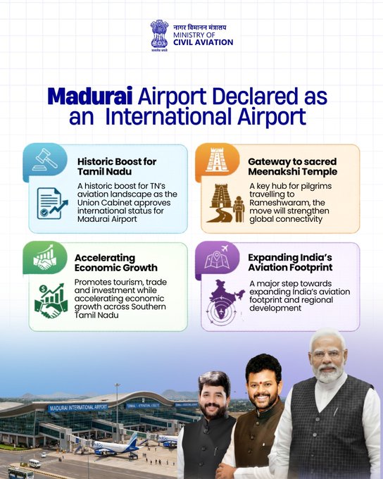 In a significant development for Tamil Nadu’s aviation sector, the Union Cabinet has approved the declaration of Madurai Airport as an International Airport. The decision marks a historic milestone for the temple city of Madurai, positioning it as a stronger global gateway for tourism, pilgrimage and trade.